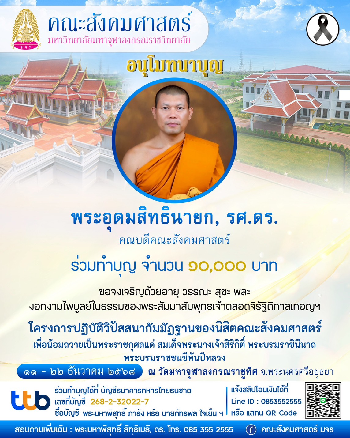 99. วันที่ 11-22 ธันวาคม 2568 ร่วมทำบุญ 10,000 บาท โครงการปฏิบัติวิปัสนากัมมัฏฐานของนิสิตคณะสังคมศาสตร์ เพื่อน้อมถวายเป็นพระราชกุศลแด่ สมเด็จพระนางเจ้าสิริกิต์ พระบรมราชินีนาถ พระบรมราชชนนีพันปีหลวง [อนุโมทนาบุญ]