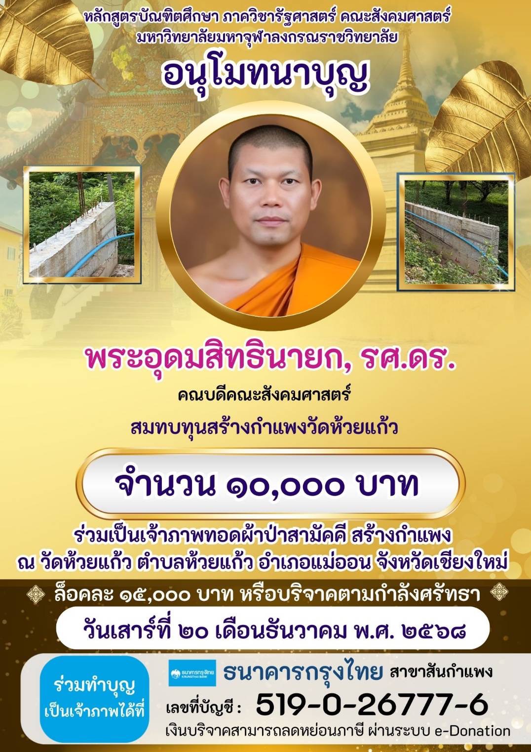 80. วันที่ 6 ธันวาคม 2567 ร่วมทำบุญพิธีทำบุญฉลองปริญญาผู้สำเร็จการศึกษา หลักสูตรบัณฑิตศึกษา ภาควิชารัฐศาสตร์ คณะสังคมศาสตร์ เป็นจำนวนเงิน 10,000 บาท [ขออนุโมทนาบุญ]